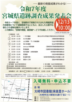 令和5~7年度に宮城県内で実施されたおもな発掘調査成果等の速報発表や出土遺物などの遺物展示を行う、令和7年度宮城県遺跡調査成果発表会を以下の日程で開催しますので、皆様御参集ください。