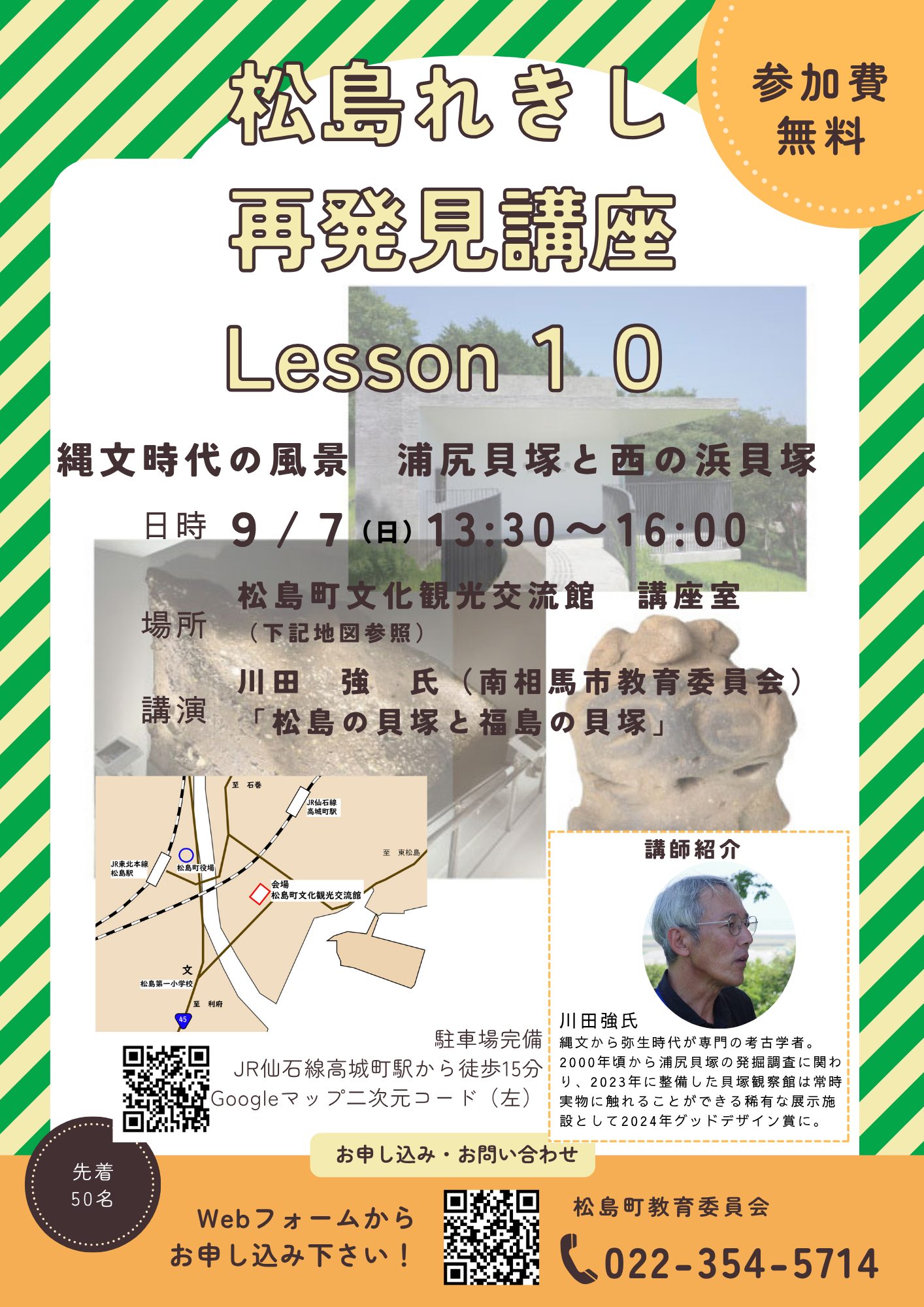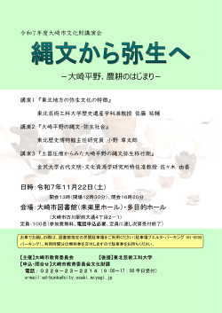 内容 本市にある里浜貝塚は100年以上の発掘調査の歴史を持つ全国的にも著名な縄文時代の貝塚です。2025年は東松島市が市制施行20周年を迎える節目の年であり、里浜貝塚が国史跡に指定されてから30周年の記念の年でもあります。本講演会では、里浜貝塚とともに古くからよく知られ、縄文時代研究に大きく貢献した3つの貝塚(愛知県吉胡貝塚・千葉県加曽利貝塚、里浜貝塚)にスポットをあて、貝塚調査の学史的な意義から近年に至るまでの発掘調査の成果、史跡の整備や保存活用など、貝塚が語る縄文の魅力をそれぞれご講演いただきます。