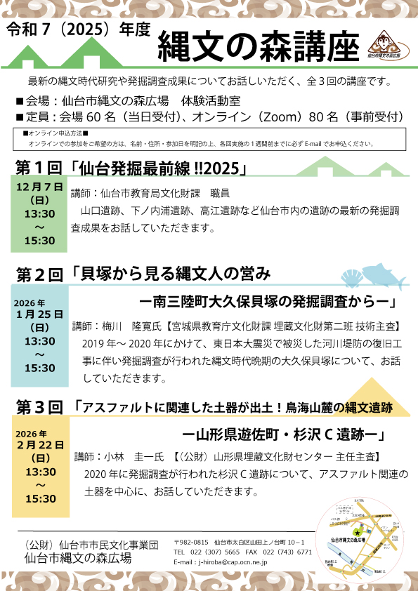 内容:山口遺跡、下ノ内浦遺跡、高江遺跡など仙台市内の遺跡の最新の発掘調査成果をお話していただきます。