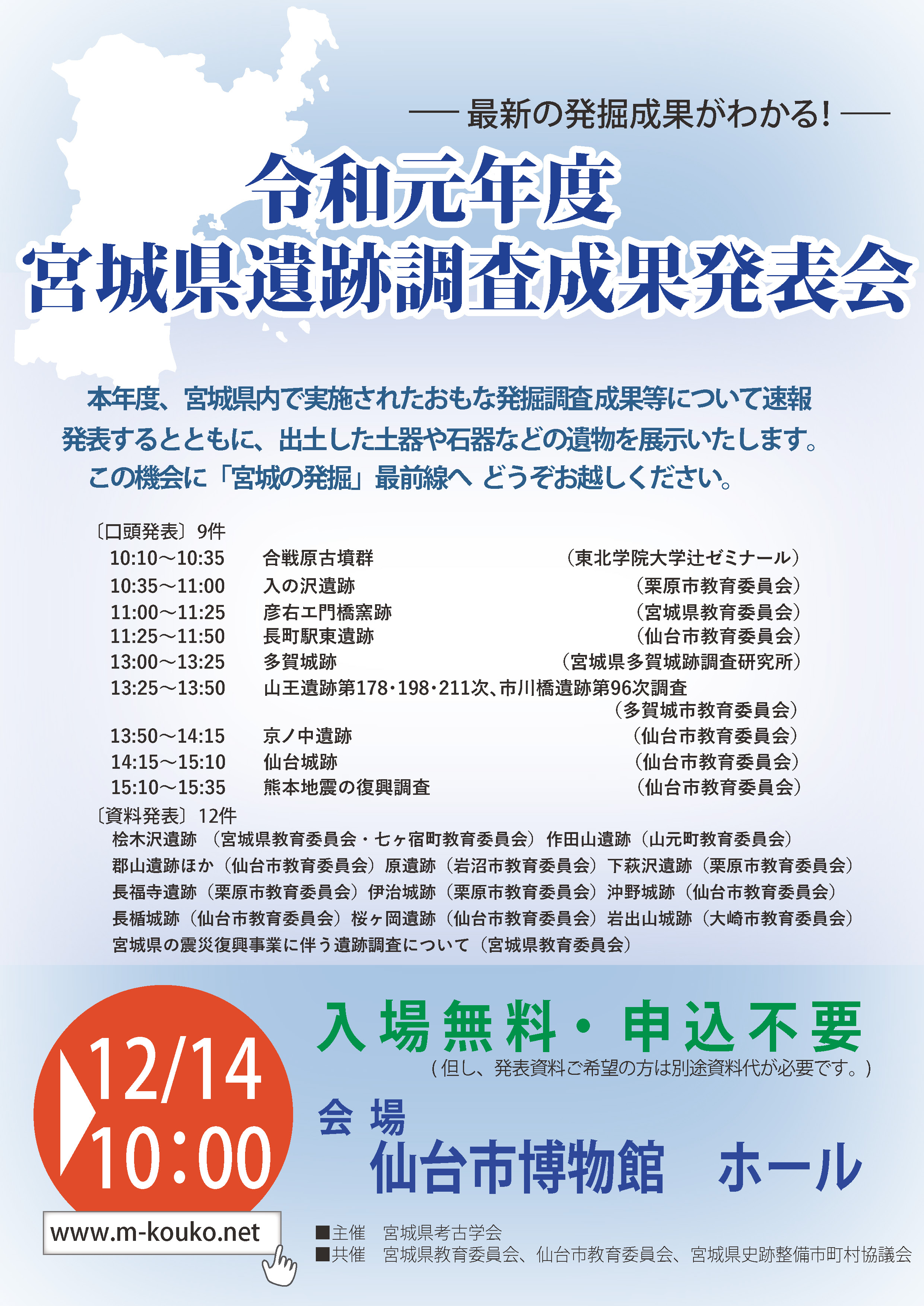 宮城県考古学会 > 遺跡調査成果発表会 > 開催告知 > 令和元年度宮城県遺跡調査成果発表会 |