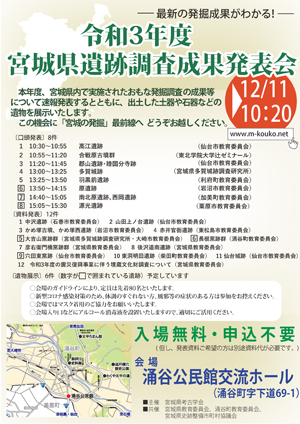 宮城県考古学会 > 遺跡調査成果発表会 > 開催告知 > 令和3年度宮城県遺跡調査成果発表会 |